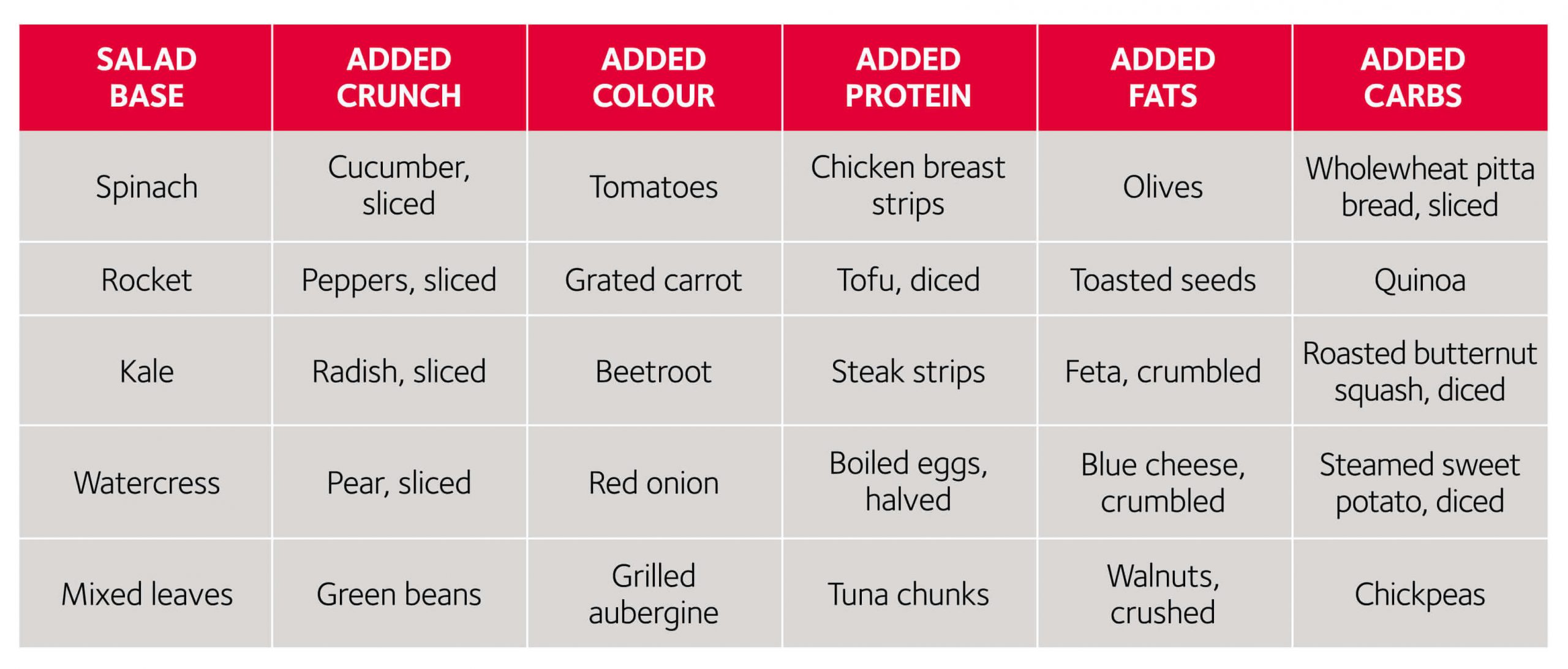 • There is almost an unlimited number of potential salad combinations to try. Don’t be afraid to experiment. Check out our handy template below that you can use to build a variety of flavour combinations.