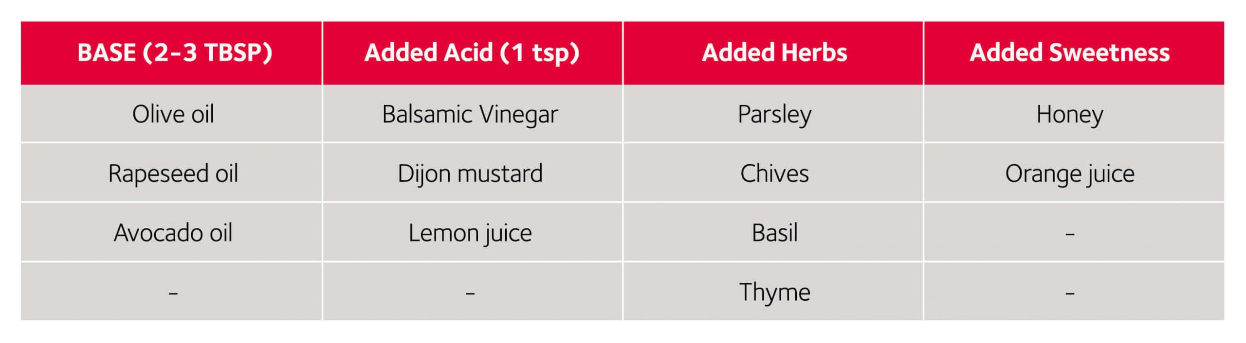 For a quick, easy and mega-tasty dressing, select one ingredient from each column in the table below. Then add everything to a mixing bowl and whisk with a fork for 30 seconds to combine.