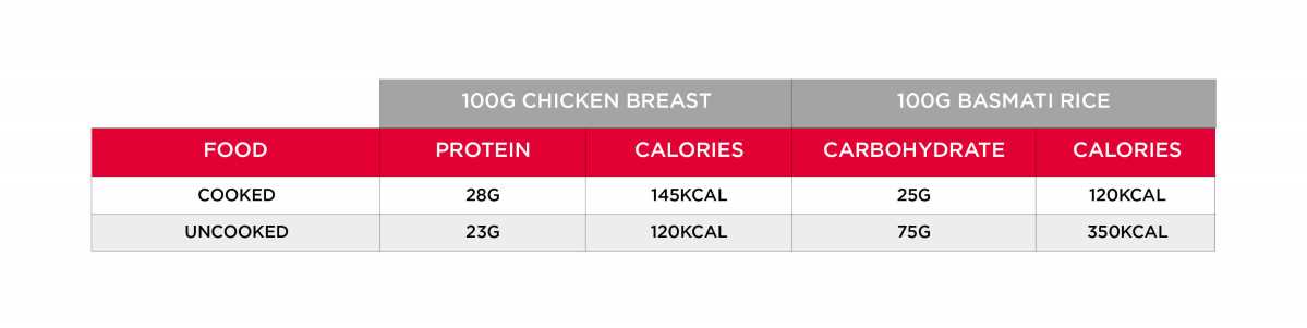 When cooking meat and fish, fluids are released, meaning that they weigh less when cooked. In contrast, starchy carbohydrates, such as rice and pasta, absorb water during the cooking process. The table below shows how 100 g of uncooked chicken breast contains fewer calories and less protein than an equivalent serving of cooked chicken breast, whereas the reverse is true for the calorie and carbohydrate content of cooked and uncooked basmati rice.
