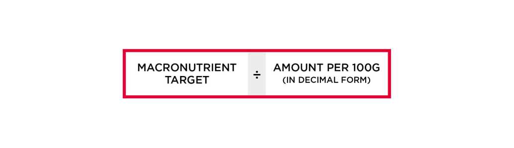 You can manually calculate the amount of food you need to meet a specific macronutrient target using the following formula: