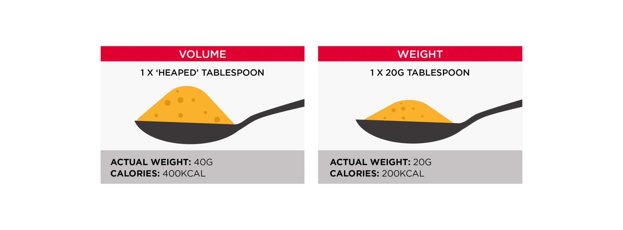 Most nutrition labels list serving sizes in terms of a standardised unit of volume, e.g., a cup or tablespoon, followed by the weight in grams. We recommend weighing your food wherever possible, as the volume-based method of measuring serving sizes can be very inconsistent.