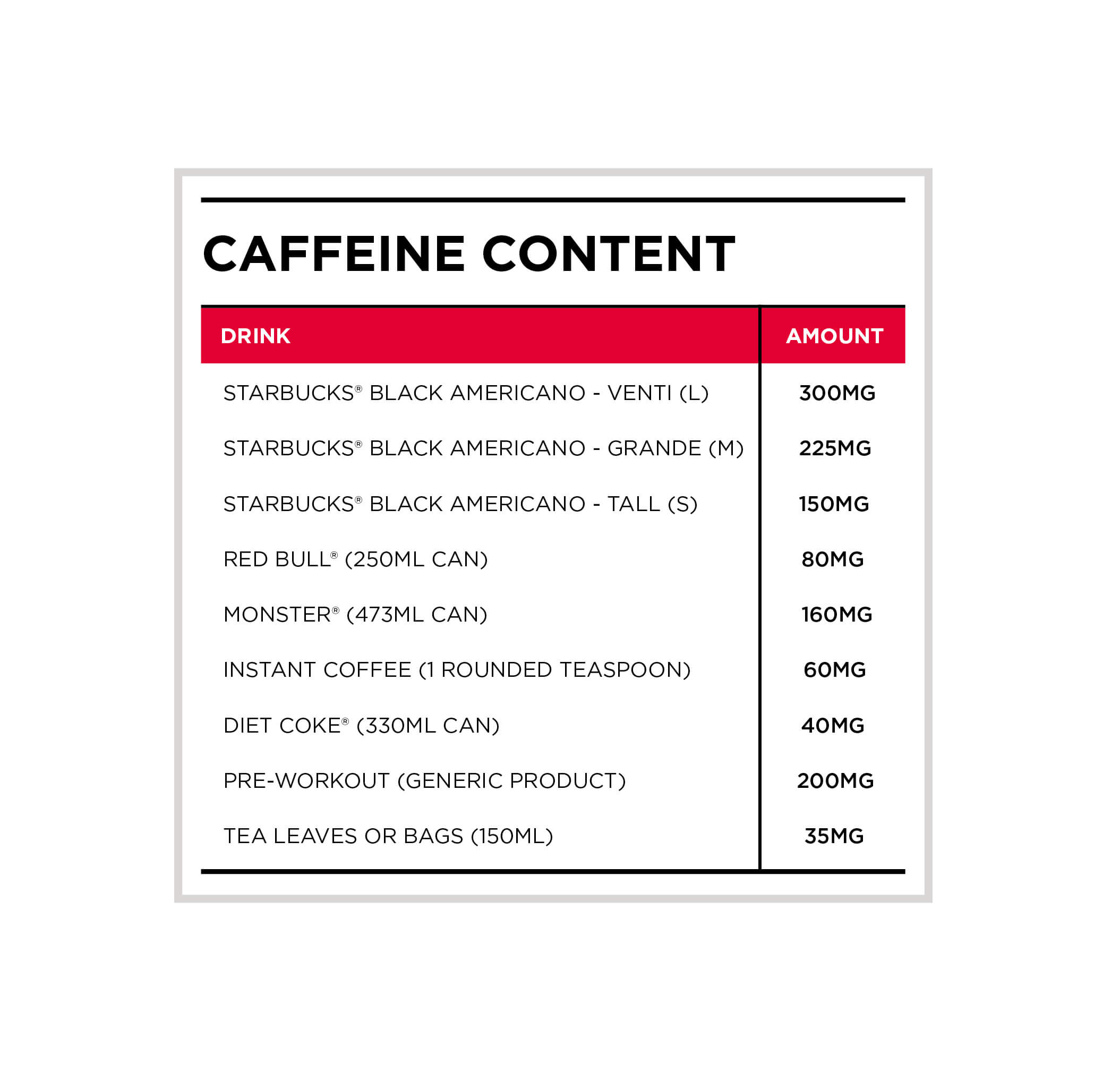 In 2015, the European Food Safety Authority (EFSA) published a report advising that consuming up to 400mg per day from all sources does not raise safety concerns in healthy adults. To help put this in context, the table below shows the caffeine content of some popular caffeinated drinks.