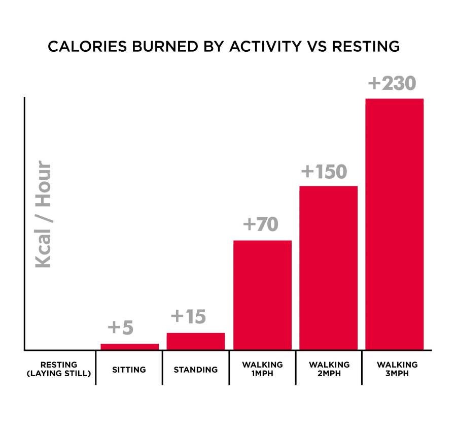The diagram above shows the calories burned performing several activities. Sit down for an hour, and you will burn roughly 5 kCal more than you would be lying down still. Stand up and this triples to 15 kCal more per hour. Start walking and you can burn up to 230 kCal more per hour. While the exact values will vary depending on your body weight and how vigorously you move, these figures highlight how simply moving around more has the potential to add up to a surprisingly large calorie count over the course of a day.